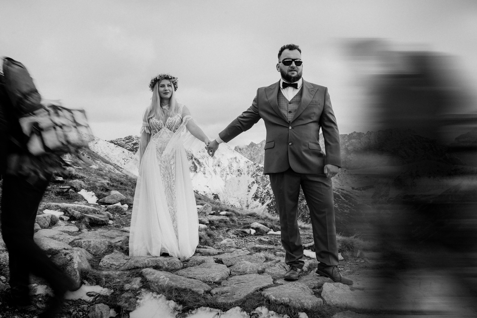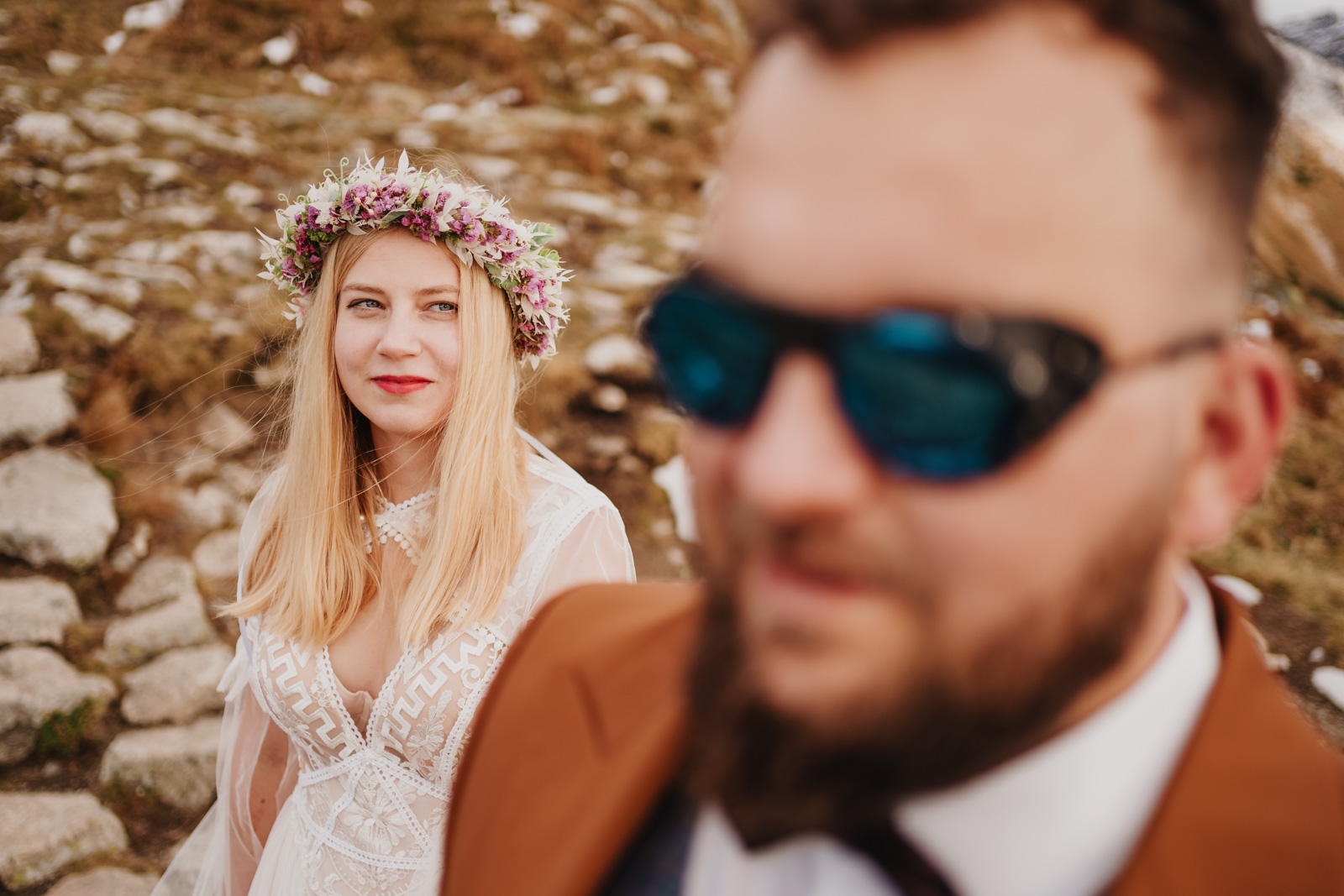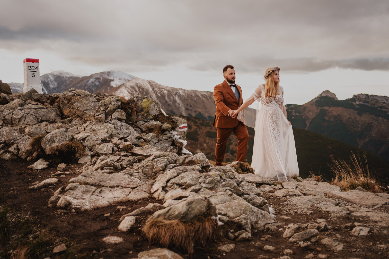 Jak zorganizować wymarzoną sesję ślubną w Tatrach? Wydaje się, że to nic trudnego i właściwie tak jest ale warto zadbać o logistykę i formalności, żeby w na luzie i w pełni szczęścia oddać się przeżywaniu sesji i podziwianiu widoków. Dla przyjezdnych takich jak my, czyli ceprów z pomorza czy innego regionu Polski, którzy w Tatry przyjeżdżają na kilka dni i czasem tylko jednego dnia dopisze im pogoda, dobrym pomysłem jest wjazd kolejką na Kasprowy Wierch. Można się tam wybrać w okolicach zachodu słońca i zjechać o ostatniej możliwej godzinie. Wtedy na górze mamy niecałe dwie godziny na sesję. Tatry są tak piękne, że czasem cztery godziny byłoby nam mało ale i te dwie w zupełności wystarczą by wykonać piękne zdjęcia ślubne.