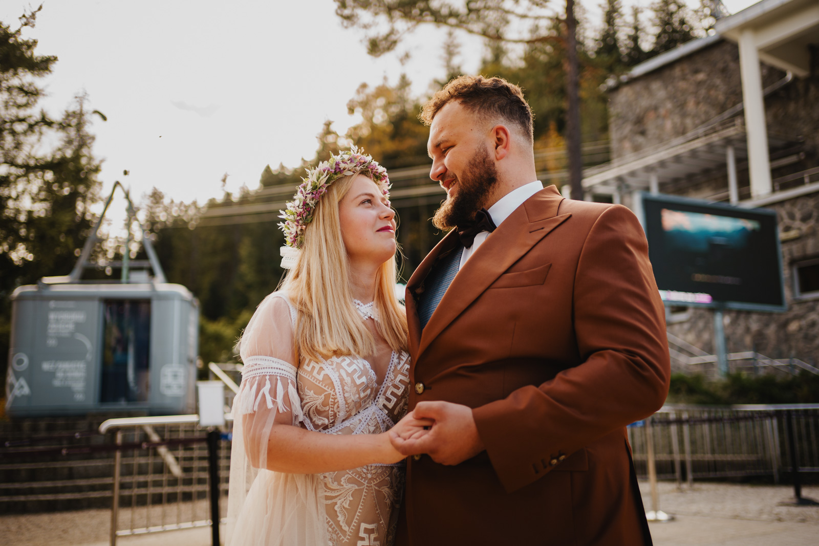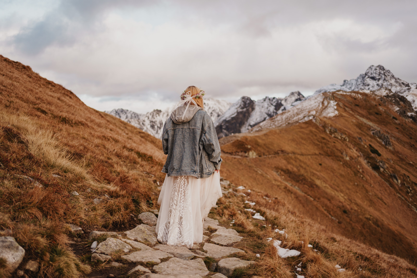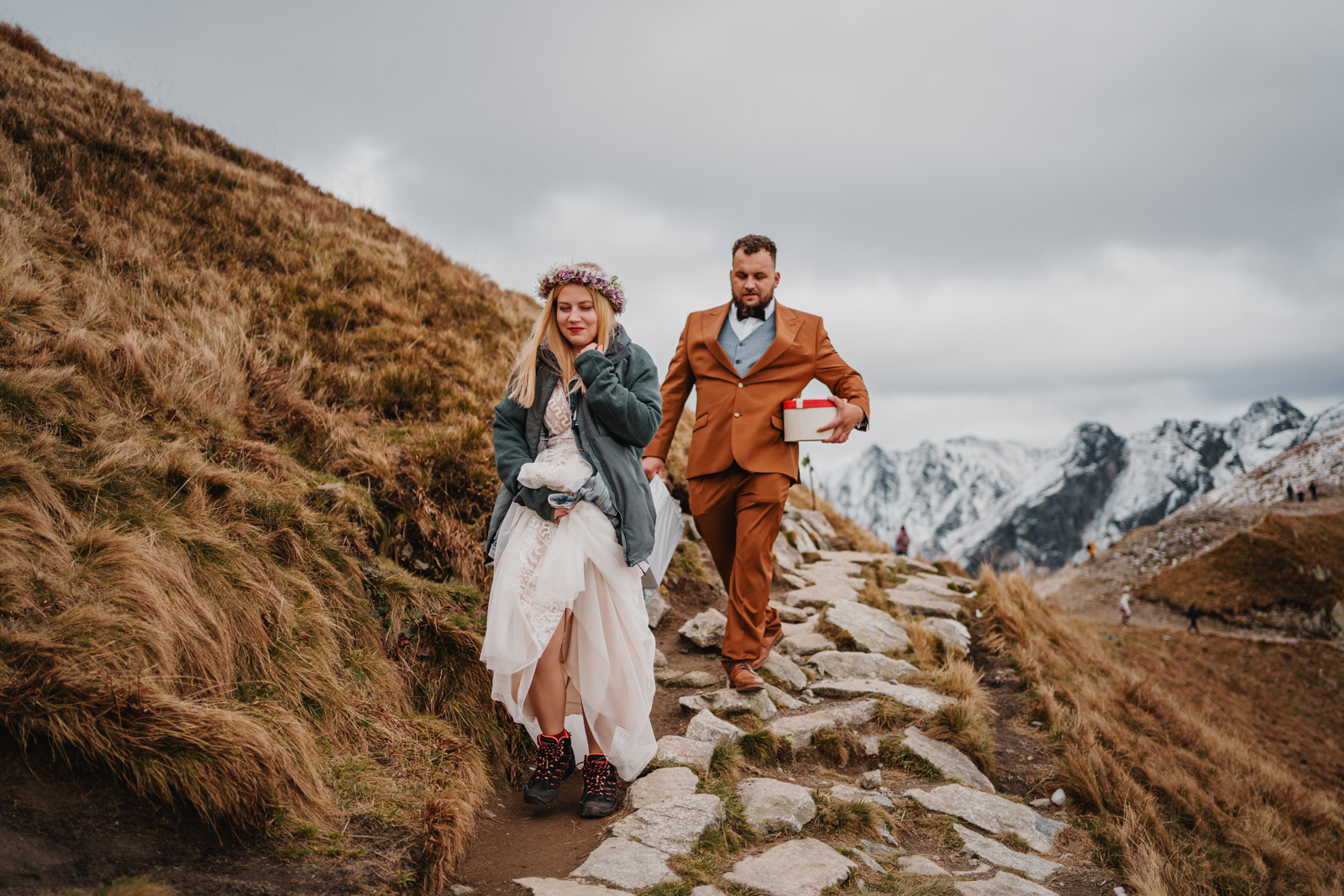 Jak zorganizować wymarzoną sesję ślubną w Tatrach? Wydaje się, że to nic trudnego i właściwie tak jest ale warto zadbać o logistykę i formalności, żeby w na luzie i w pełni szczęścia oddać się przeżywaniu sesji i podziwianiu widoków. Dla przyjezdnych takich jak my, czyli ceprów z pomorza czy innego regionu Polski, którzy w Tatry przyjeżdżają na kilka dni i czasem tylko jednego dnia dopisze im pogoda, dobrym pomysłem jest wjazd kolejką na Kasprowy Wierch. Można się tam wybrać w okolicach zachodu słońca i zjechać o ostatniej możliwej godzinie. Wtedy na górze mamy niecałe dwie godziny na sesję. Tatry są tak piękne, że czasem cztery godziny byłoby nam mało ale i te dwie w zupełności wystarczą by wykonać piękne zdjęcia ślubne.