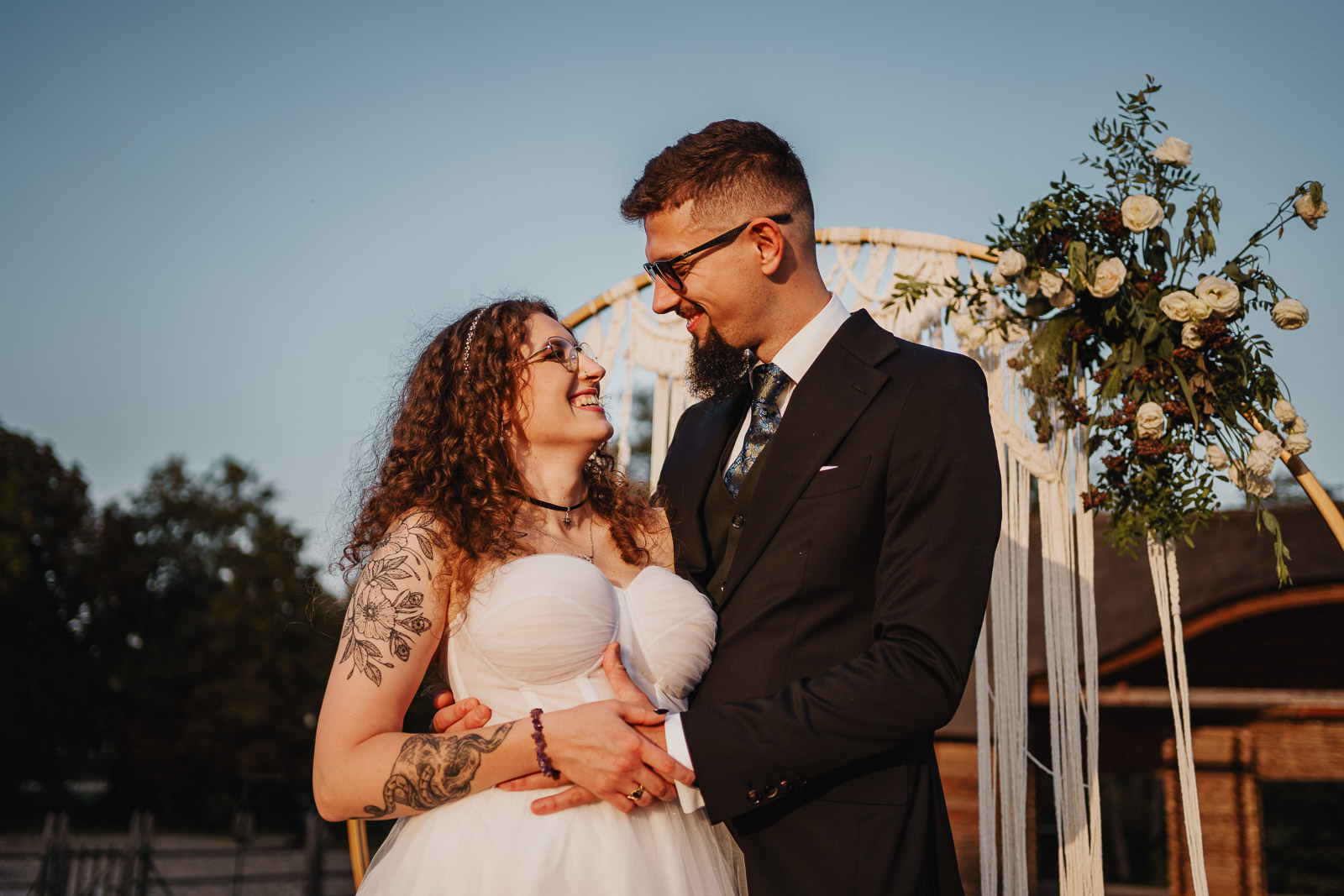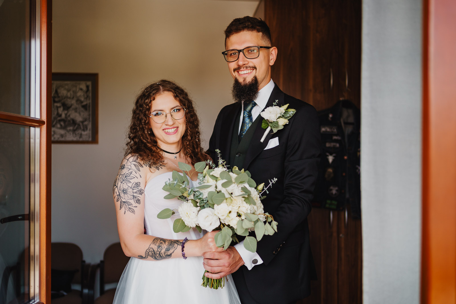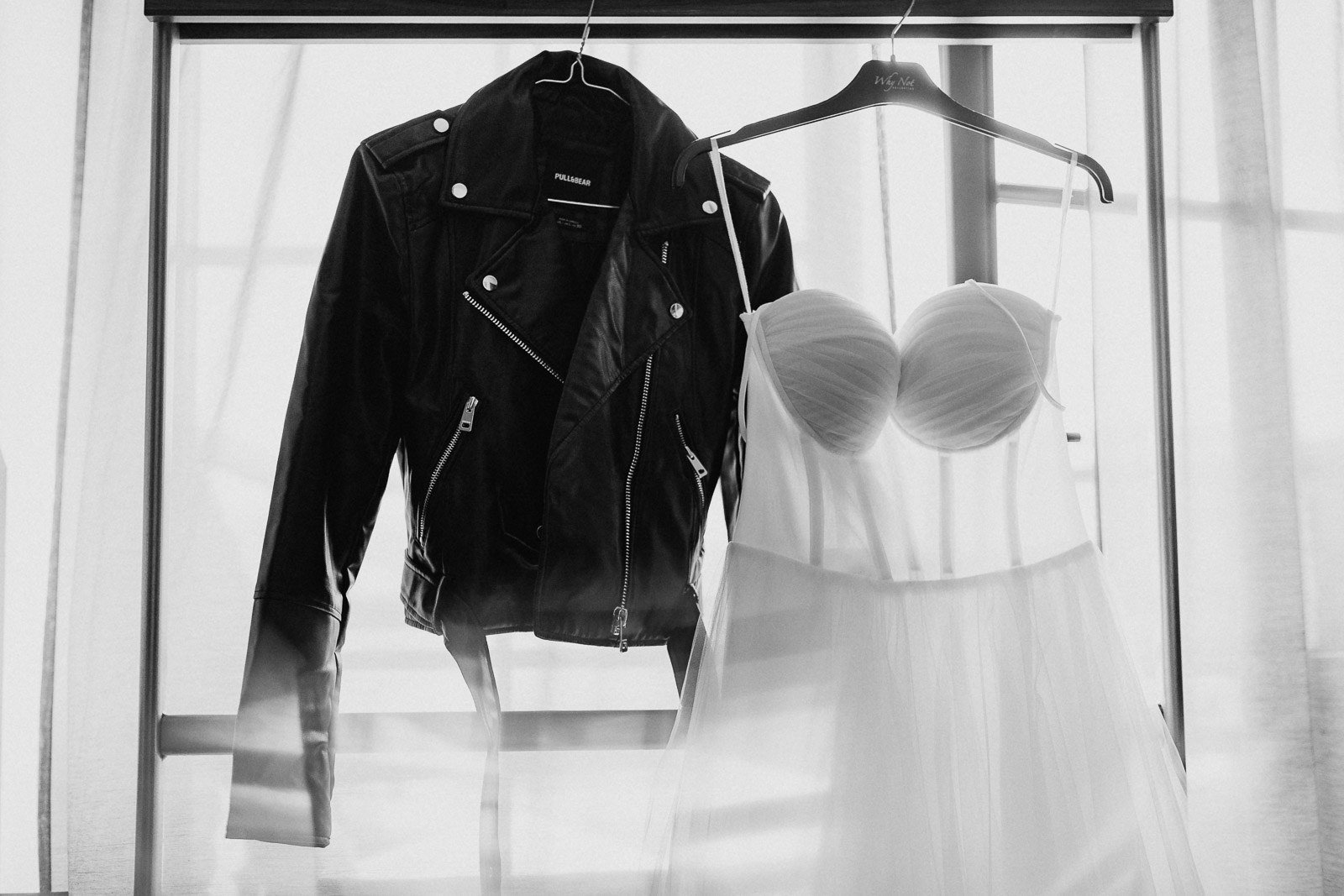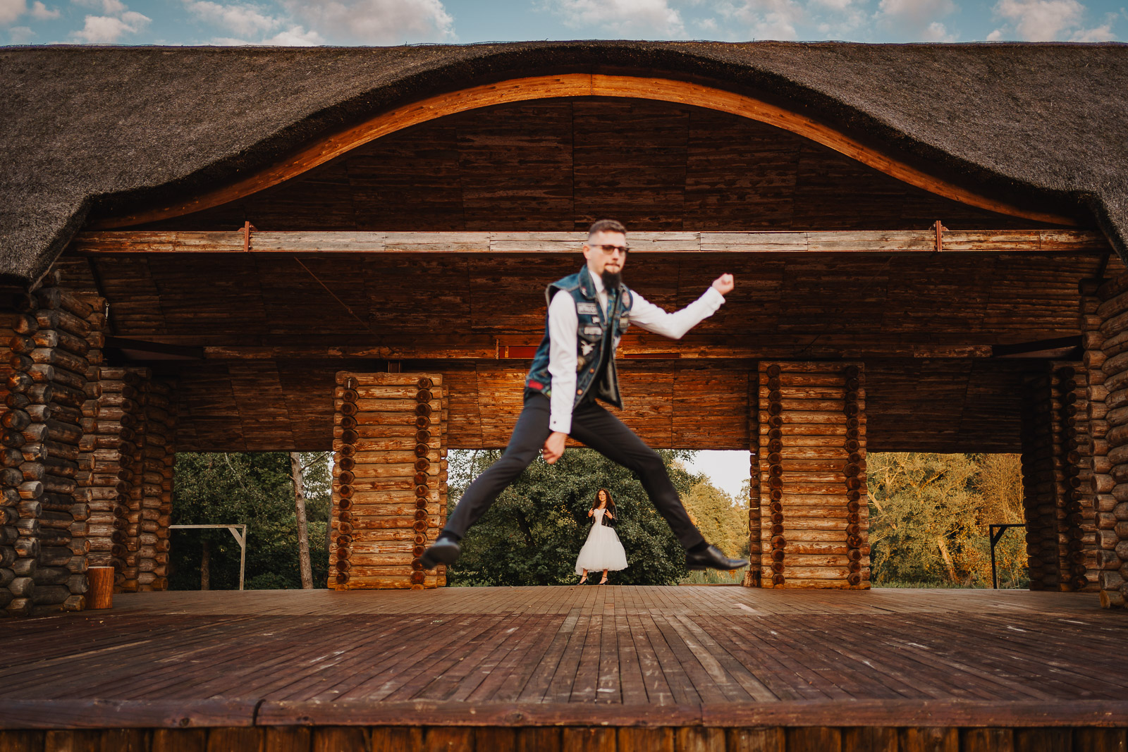 Biała suknia ślubna w zestawie ze skórzaną ramoneską, to jest to, co zdecydowanie dobrze współgra z jeansową kamizelką Pana Młodego :)