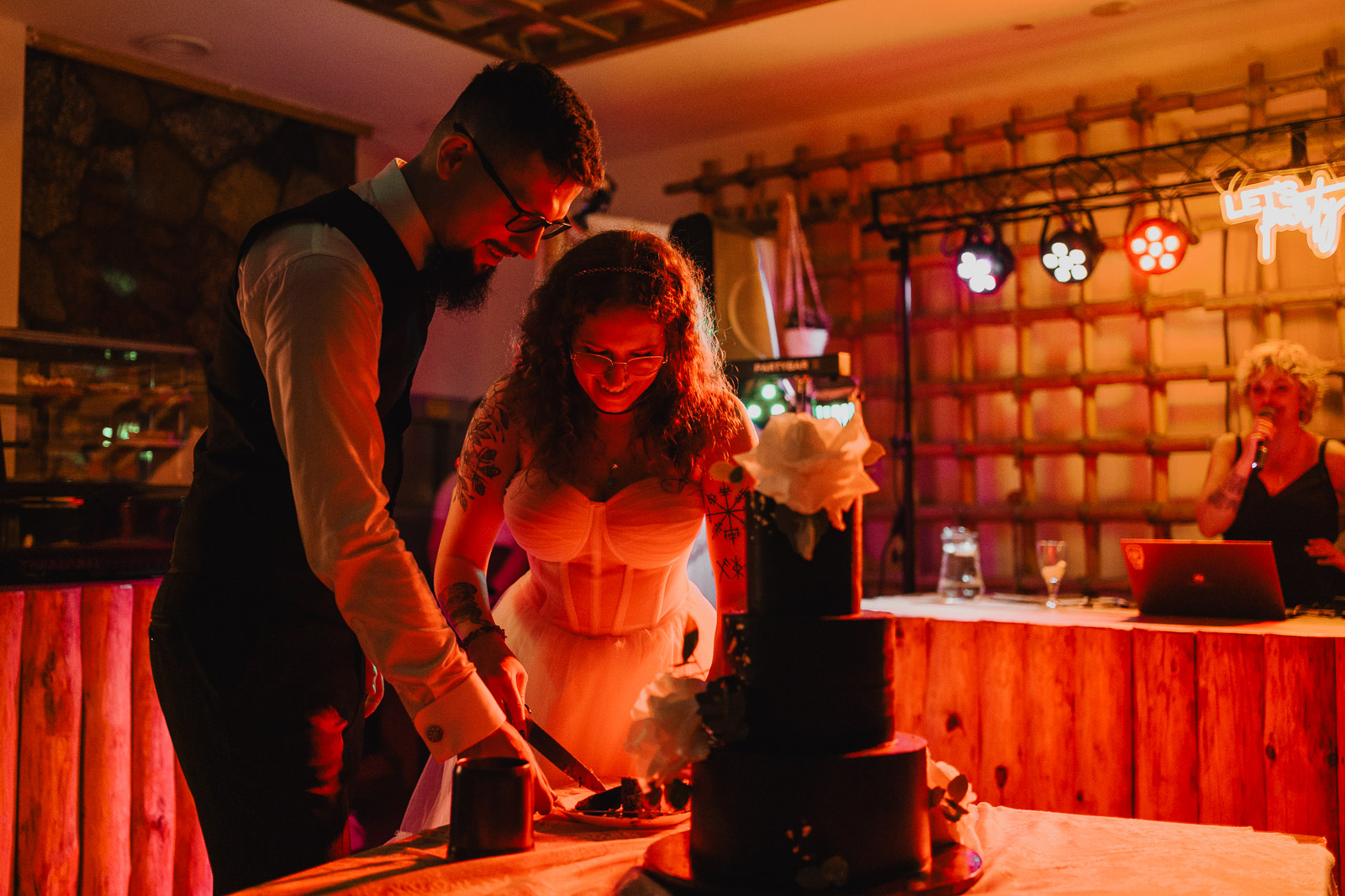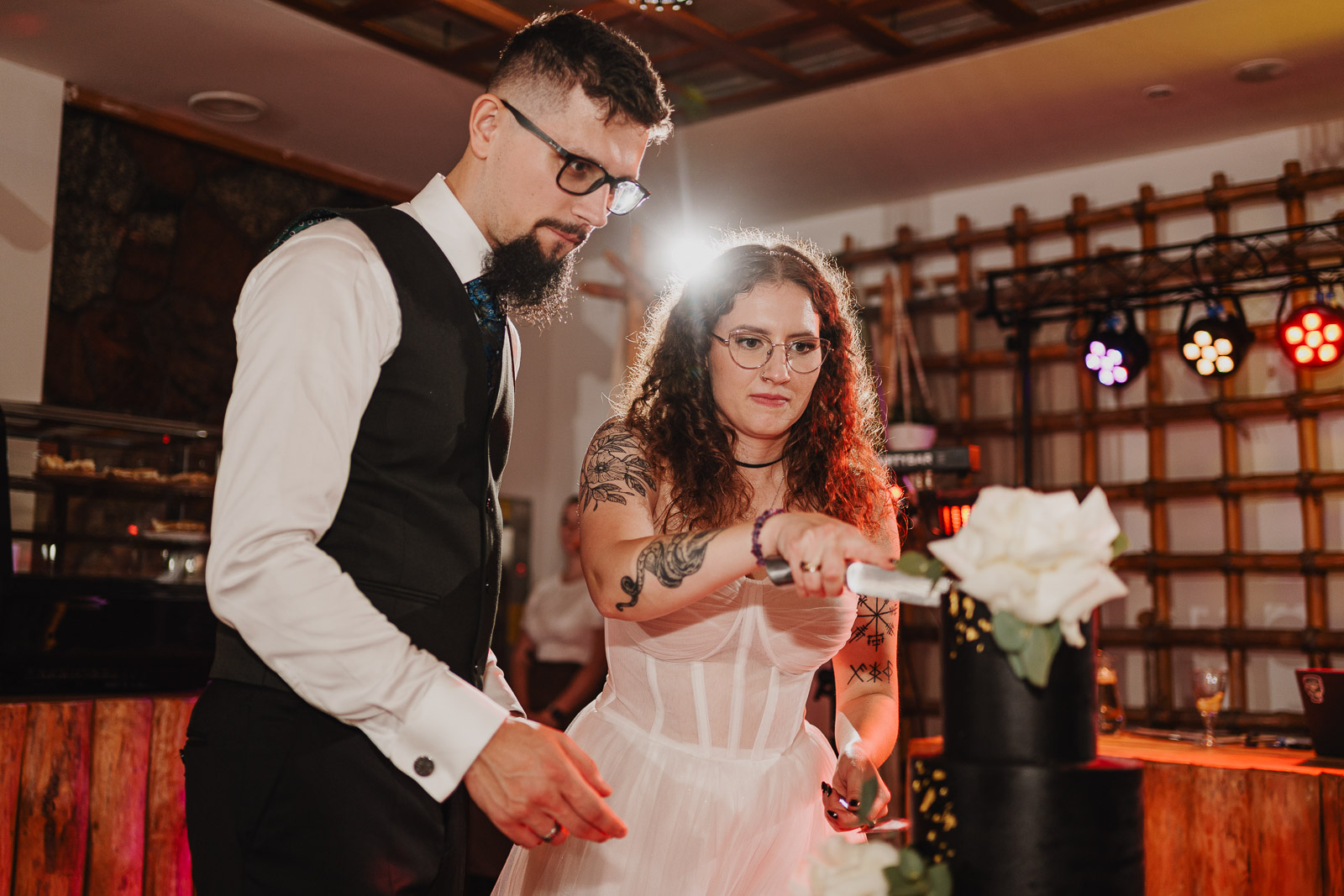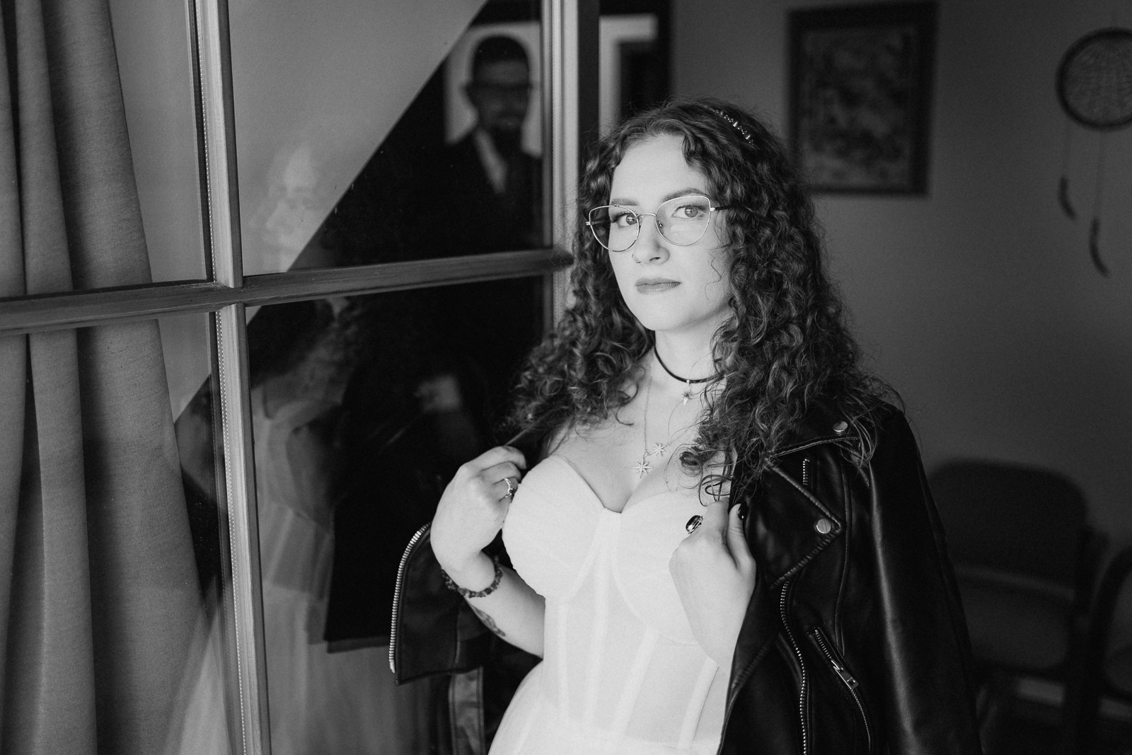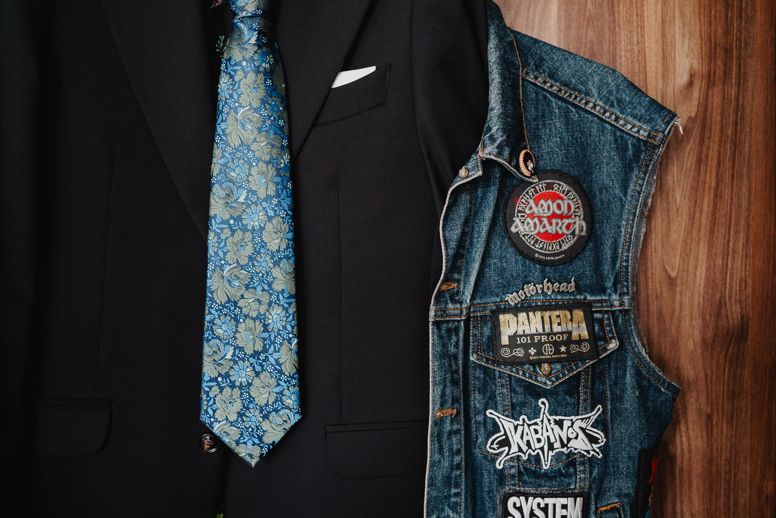 Biała suknia ślubna w zestawie ze skórzaną ramoneską, to jest to, co zdecydowanie dobrze współgra z jeansową kamizelką Pana Młodego :)