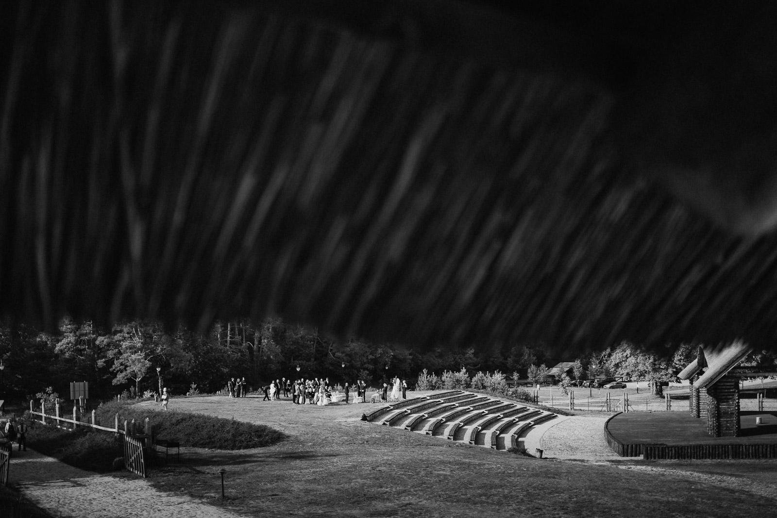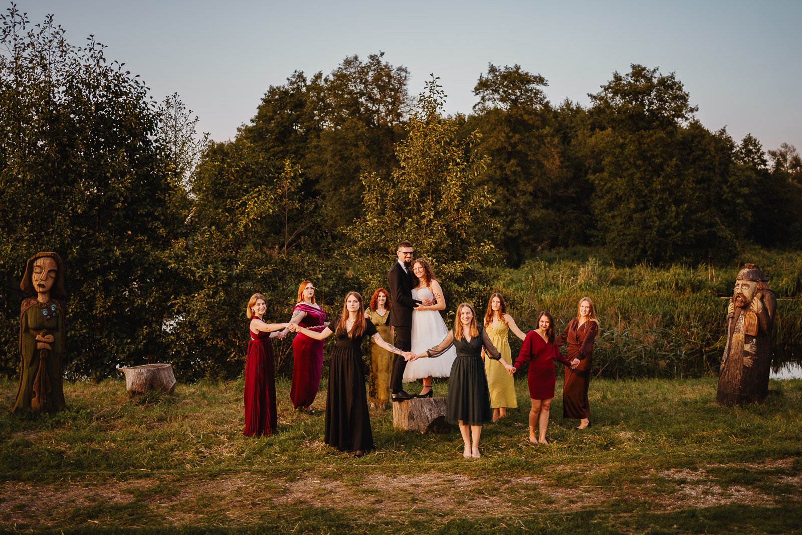 Plenerowy ślub w otoczeniu przyrody to jest coś, co chyba każdy fotograf lubi. Piękne obrazki, przyroda w tle, słońce i błękit nieba. Ale jest tu coś jeszcze , czego w sali ślubów czy też kościele nie da się zrobić. Można oddalić się o kilka dużych kroków i sfotografować całą ceremonię w szerokim kadrze jak ten poniżej.