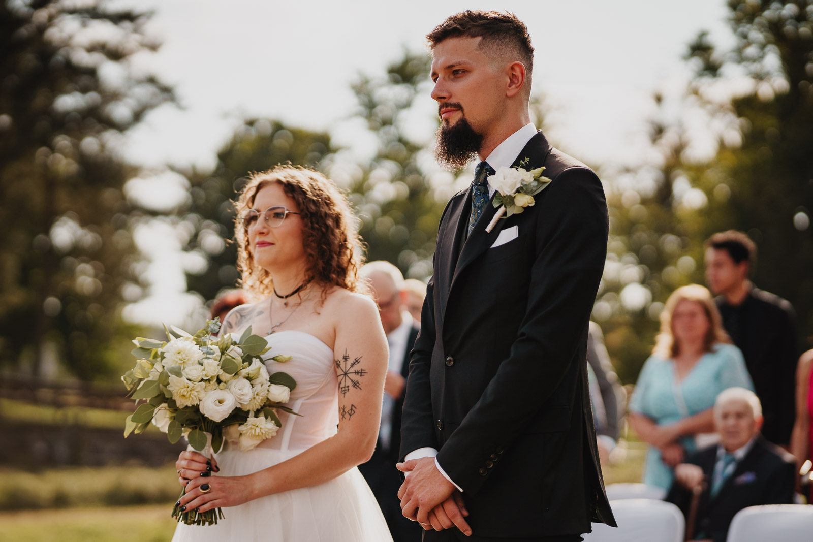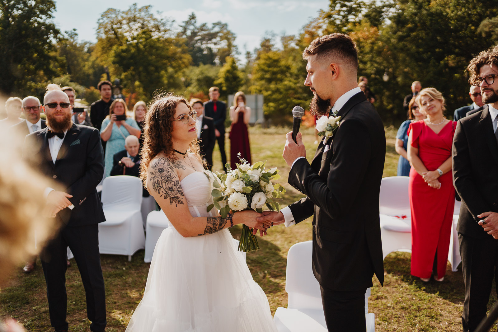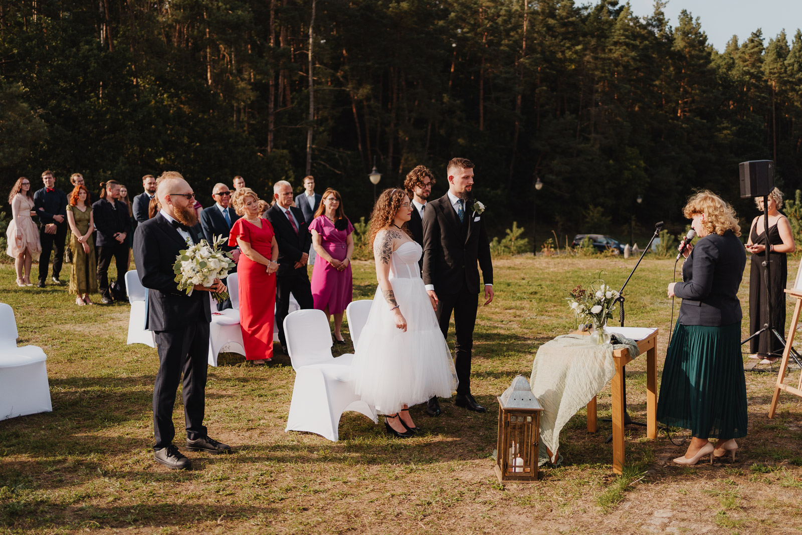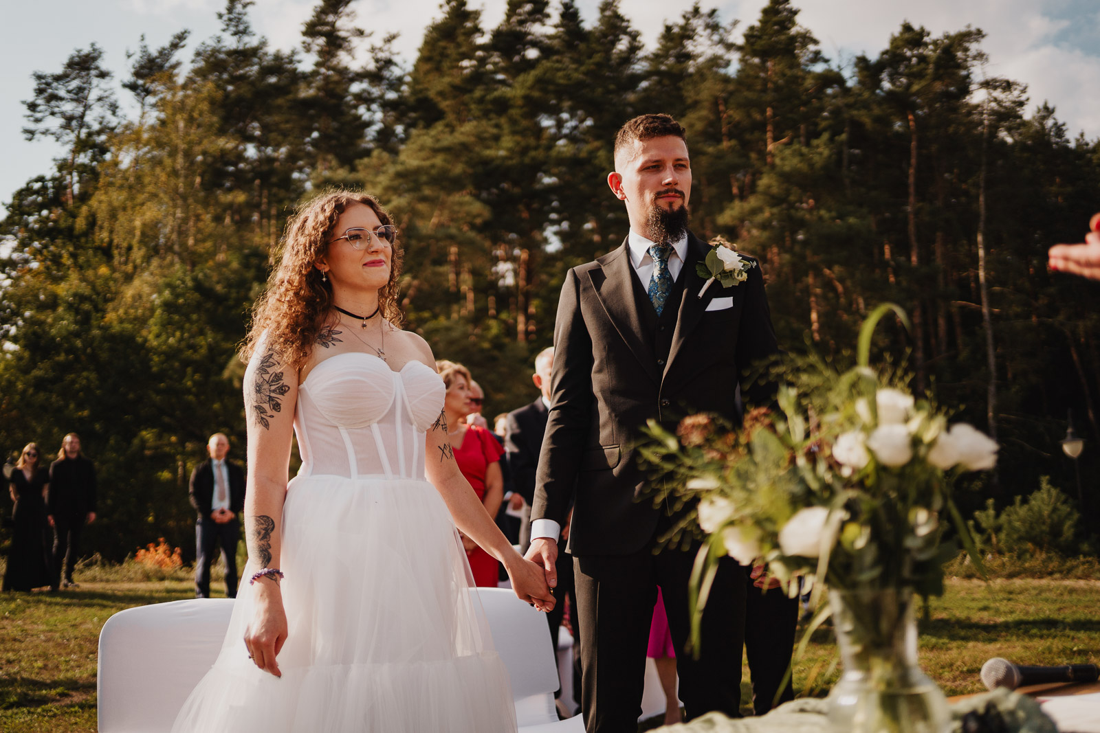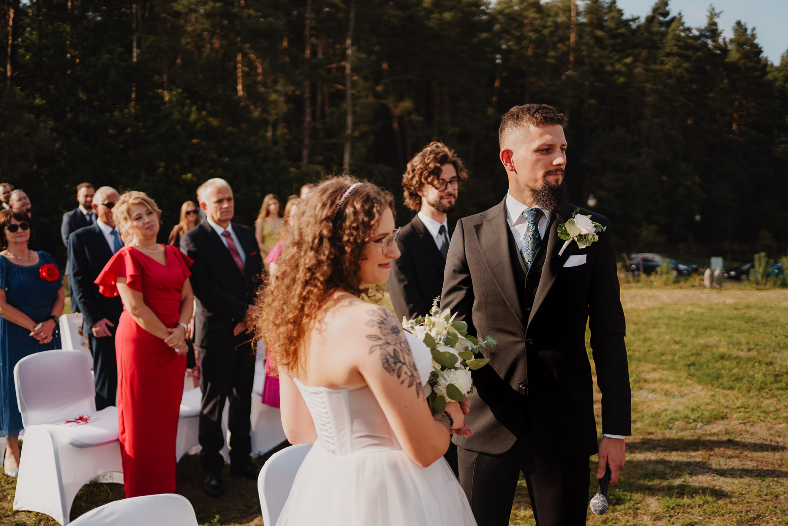 W naszej historii przyszedł czas na ceremonię ślubną. Karolina i Krzysztof zaprosili swoich gości na polanę nad owidzkim amfiteatrem, by tam przez Panią Kierownik USC, ślubować sobie małżeństwo. Okoliczności przyrody wyjątkowe. Za plecami ściana lasu, przed sobą amfiteatr i meandry rzeki Wierzycy. Nawet słońce, do tej pory niezbyt pewne, postanowiło Im zaświecić :)