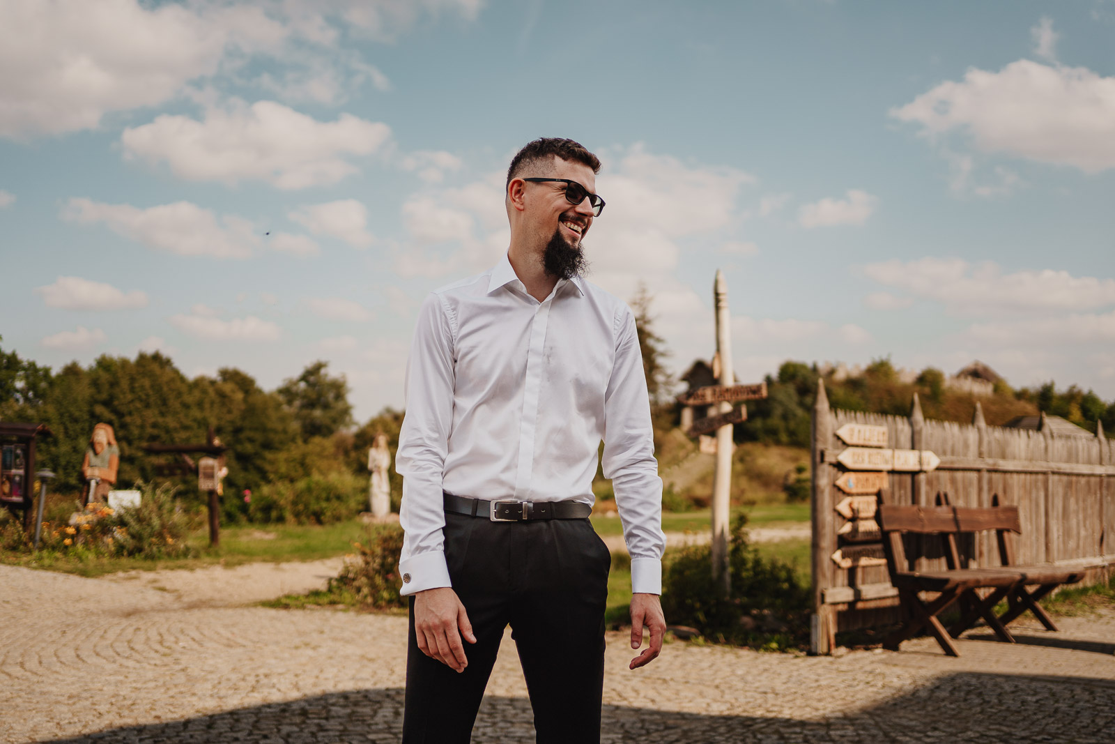 Sesja w dniu ślubu to temat, który coraz częściej pojawia się na moich weselach i już chyba stał się ich stałym elementem. Jeśli tylko pogoda na to pozwala, staram się porwać Parę Młodą na kilkanaście minut i w tym czasie wykonać mini sesję, z której powstaje zazwyczaj kilka – kilkanaście ciekawych, różnych od siebie zdjęć. Jeżeli taka pamiątka w postaci sesji Wam wystarczy – super. Jeśli nie – zawsze możemy umówić się po weselu i spędzić więcej czasu na klasycznej sesji plenerowej. Ta forma wykonania sesji ma jednak jeden największy atut. Coś, co trudno odtworzyć podczas sesji ślubnej w innym terminie. To emocje – tego dnia każda Para Młoda jest w tym szczególnym nastroju, który już się nie powtórzy, podobnie jak ten dzień. Warto uchwycić to na zdjęciach. Na weselu Karoliny i Tomka pogoda dopisała nam wyjątkowo, co w połączeniu z bogactwem ciekawych miejsc, które oferował nam teren Grodziska Owidz, spowodowało że z kilkunastu minut zrobiło się małe pół godziny :D No ale było warto, a delikatną reprymendę od przemiłej DJ-ki Marty, przyjąłem dzielnie :)