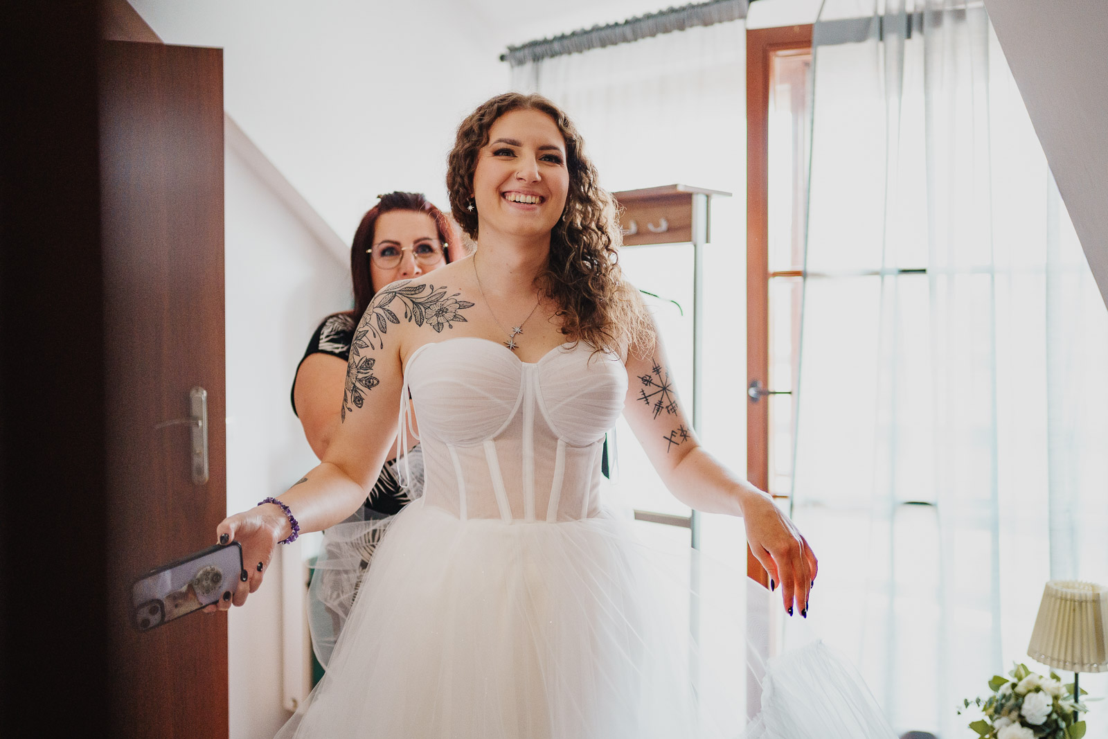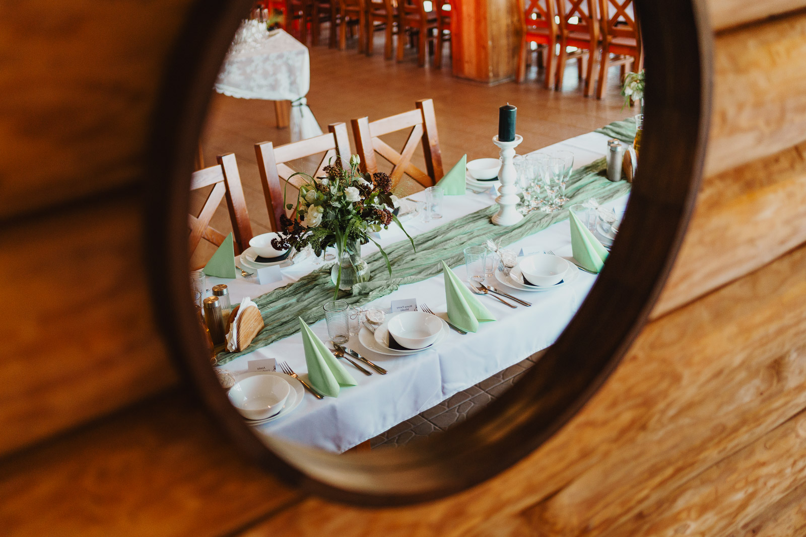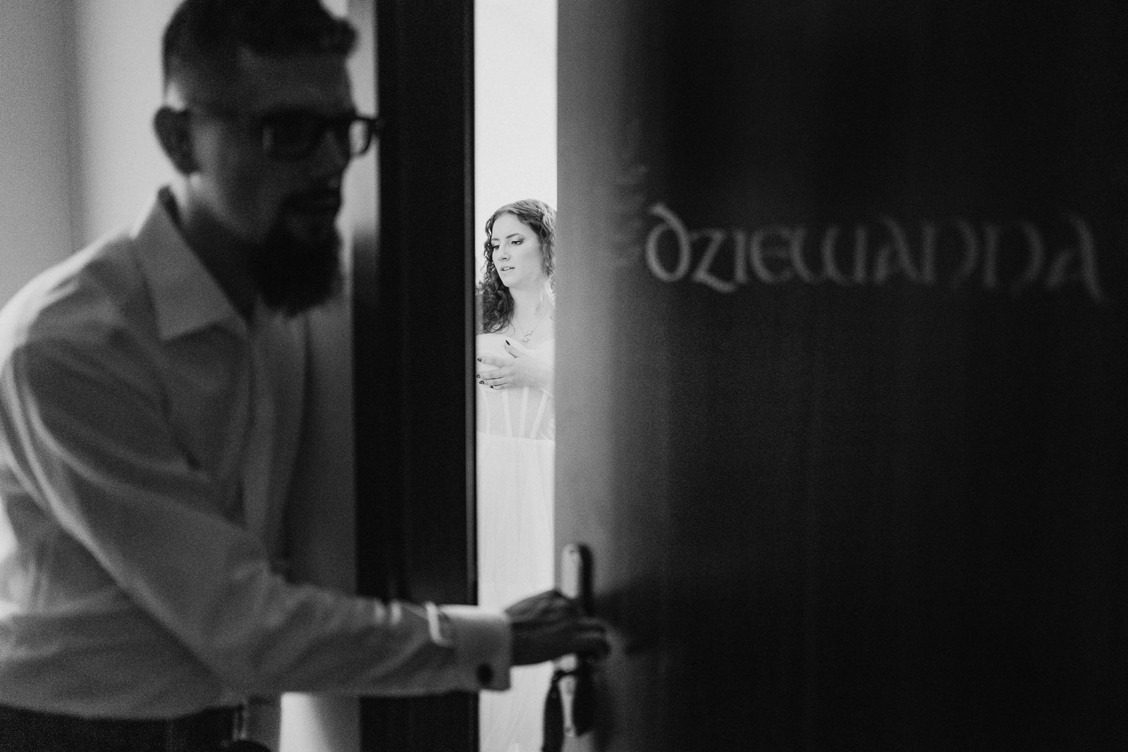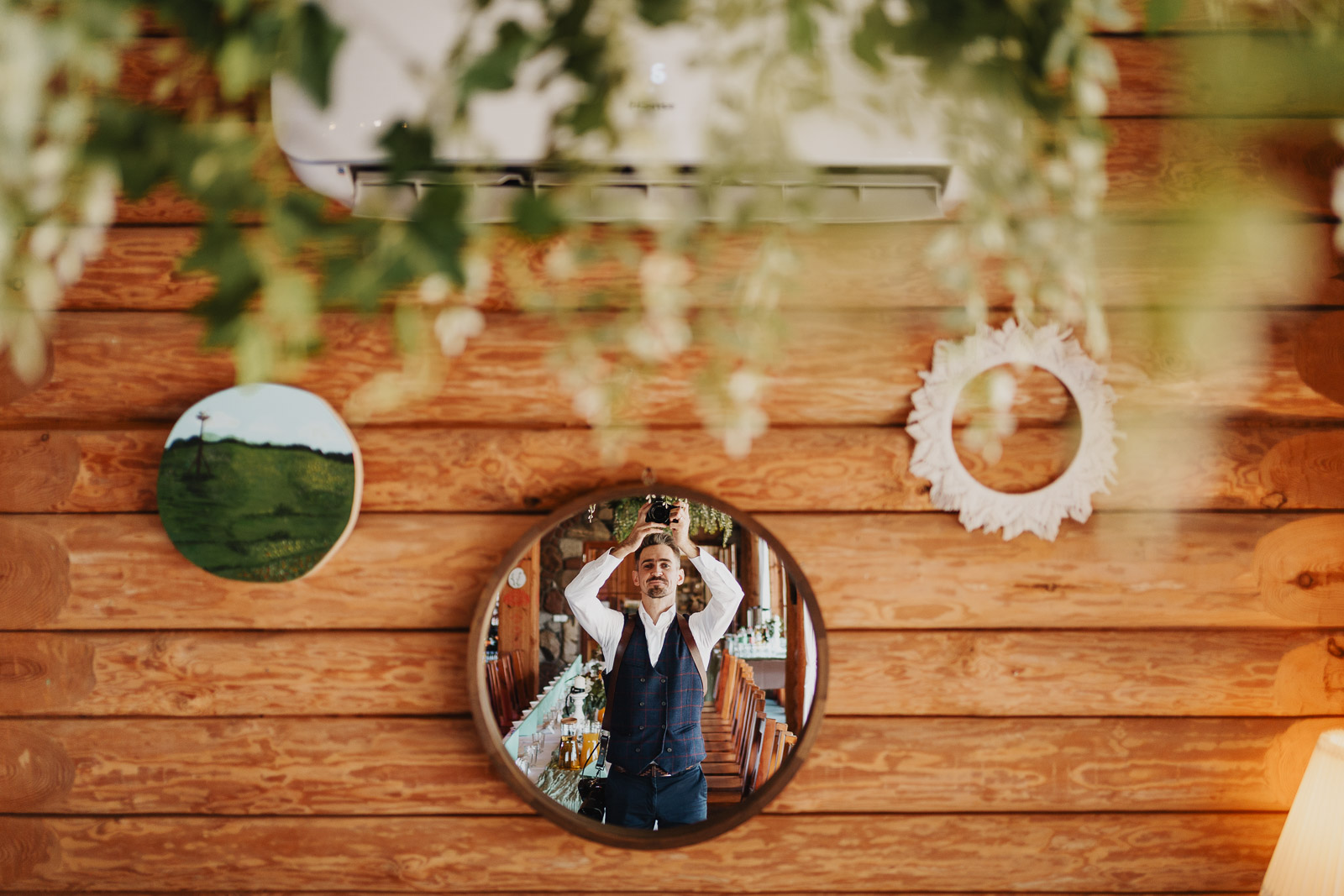 Skoro jest lustro, w dodatku na pięknie udekorowanej ścianie i z salą weselną w tle, to fotograf ślubny nie może przejść obok niego obojętnie. Czas na selfie :D Przy okazji to miejsce na mały blok reklamowy. Szukacie fotografa, który uwieczni prawdziwe wydarzenia i emocje bez ingerowania i ustawiania czegokolwiek na Waszym ślubie? W takim razie jesteście we właściwym miejscu. Moje Pary Młode bardzo często podkreślają, że w dniu swojego ślubu nie czuły presji związanej z tym, że przez niemal cały czas ktoś robi im zdjęcia. Jeśli czujecie podobnie – zapraszam do sprawdzenia mojej oferty a następnie kontaktu poprzez formularz na stronie, o tutaj: OFERTA
