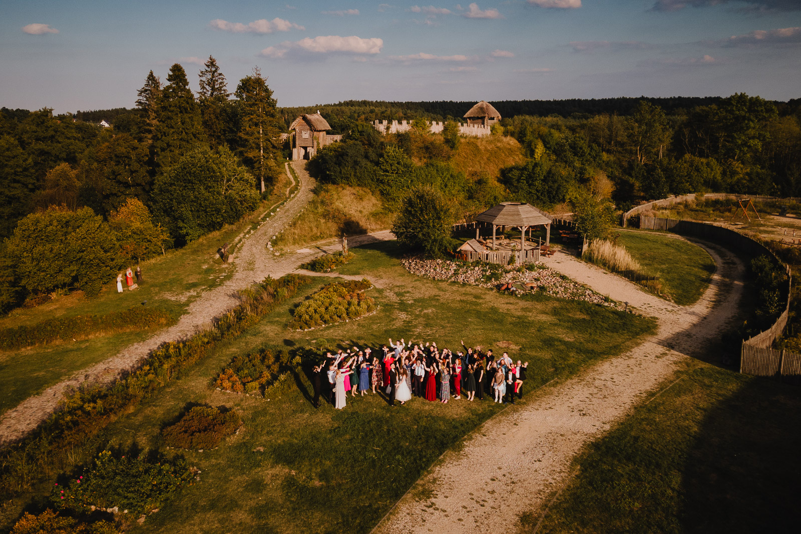 Zdjęcie grupowe z drona. Wykonaliśmy też klasyczne zdjęcie grupowe oraz zdjęcia z gośćmi ale widoki jakie rozpościerają się wokół owidzkiego grodu sprawiły, że po raz drugi postanowiłem wystartować drona i pokazać nieco więcej z perspektywy lotu ptaka.